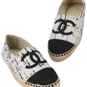These fun Chanel Tweed/Leather Cap Toe CC Espadrille Flats can enhance any style. These highly sought after espadrilles are a must have for any trendy fashionista! These flats include the signature woven rope Espadrille style with a single level and a large CC stitching on each tweed upper. These espadrille soles will take you on any daytime adventure or evening excursion. The soles have light signs of gentle wear. The uppers remain clean and overall in great condition. The foot beds have some light rubbing to the embossed Chanel logo.