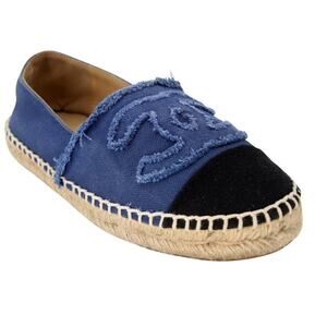 These fun Chanel Navy Blue Linen Espadrille Flats can enhance any style. These highly sought after espadrilles from 14P are a must have for any trendy fashionista! These flats include the signature woven rope Espadrille style and a large CC stitching on each linen upper. These espadrille soles will take you on any daytime adventure or evening excursion. The soles include wear with basic signs of  wear. The uppers are clean with natural creasing but overall remain in great condition. The foot beds are clean with wear and creasing. Overall the shoes remain in great condition.
