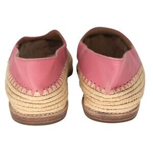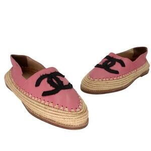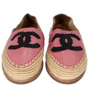 From the Spring Summer Greek Collection these gorgeous smooth Pink lambskin leather with a woven raffia espadrille flat with contrasting black grosgrain CC logo across the toe make the Chanel Greek Summer Loafers the perfect summer shoe for you. The soles have wear from normal use. The uppers show wear and creasing. Overall they remain in great condition.