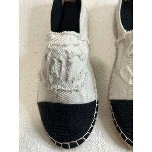 Step into effortless chic with these Chanel espadrilles. A study in understated elegance, these slip-on flats feature a classic black cap toe that contrasts beautifully with the neutral canvas body. The iconic CC logo is subtly embroidered on the vamp, adding a touch of luxury. The jute trim around the sole provides a relaxed, summery vibe, while the comfortable insole ensures all-day wearability. These espadrilles are perfect for a casual brunch, a day of shopping, or a weekend getaway.