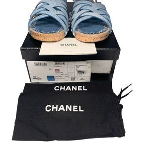 Chanel Fantasy Blue Calf Leather CC Logo Wooden Platform Sandals EU 38 US 7-7.5