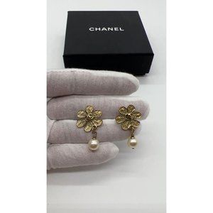 Chanel Faux Pearl Floral CC Drop Gold Tone Earrings