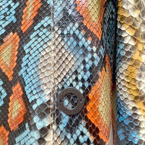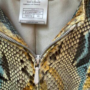 Great Condition Authentic Chanel REAL PYTHON SKIN Short Zip Front Collarless Jacket French Size 40 US 8. Natural python colors of ivory and beige, hand painted with turquoise blue, orange and yellow.
