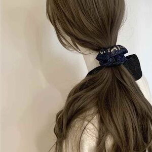 Elegant Chanel scrunchie set featuring cream and navy colors. Perfect for adding a touch of luxury to your hairstyle.