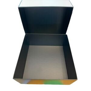 Used Chanel classic black and white gift box. Made of sturdy cardboard. Square shape. Great for storage of small personal items or use as a gift box. Measures approximately 8.5” long, 8.5” wide, and 3.5” deep. Comes with a couple small rectangle pieces of Chanel branded tissue paper which has some tears and rips and shredded tissue paper. In good condition with some light use wear, scuff on top and bottom.