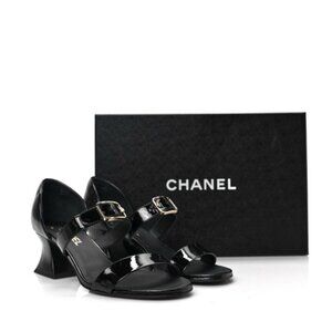 Chanel Goatskin Heel Logo Sandals Open Toe Black Patent Leather EU 39.5 US 9.5