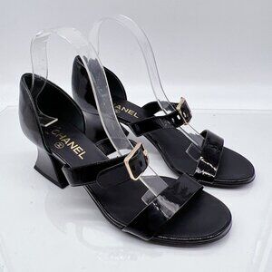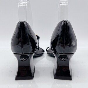 Chanel Goatskin Women’s Heels Sandals Shoes Open Toe Black Patent EU 39.5 US 9.5