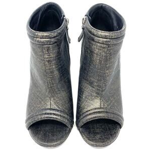Elevate your look with these striking Chanel open-toe wedge ankle booties, crafted from distressed gold-black metallic leather with the signature CC logo hardware and a sculptural silhouette. A bold, timeless statement heel blending luxury, comfort, and architectural design.