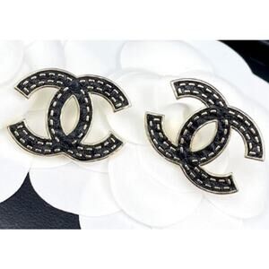 Chanel Gold Tone with Black textured detail Interlocking CC Earrings