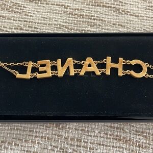 Elegant Chanel bracelet featuring a gold finish with sparkling crystal accents. Perfect for adding a touch of luxury to any outfit. New without tags