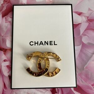 Elegant Chanel brooch in gold adorned with sparkling crystals. Perfect for adding a touch of luxury to any outfit.