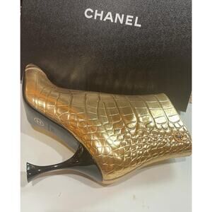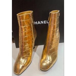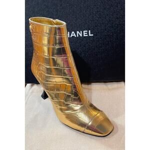 Chanel Calfskin Crocodile Embossed Cap Toe Ankle Boots Gold Size 36, 37.