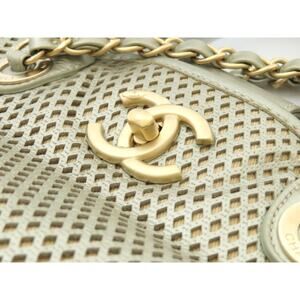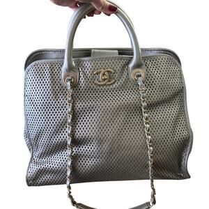 • This stylish tote is beautifully crafted of soft calfskin leather with a miniature diamond perforation across the entire bag in metallic silver. This features both rolled top handles and matte gold chain link leather threaded shoulder straps and a facing matte gold Chanel CC turn lock. This opens to a partitioned beige fabric interior with zipper and patch pockets.