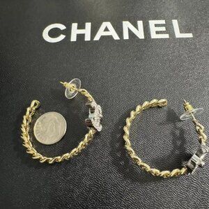 Introduce a touch of glamour to your outfit with these exquisite gold-tone Chanel earrings. Featuring a stunning double icon design, these earrings are perfect for adding a touch of sophistication to any look. The screw-back closure ensures they stay securely in place while the resin material and crystal stones offer durability and a touch of shimmer. These hoop-style earrings are ideal for any occasion and will complement any outfit with their classic style.