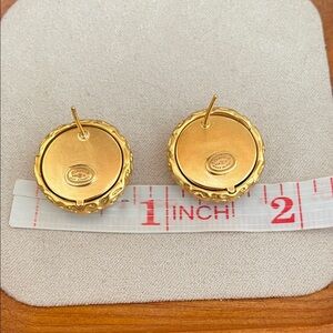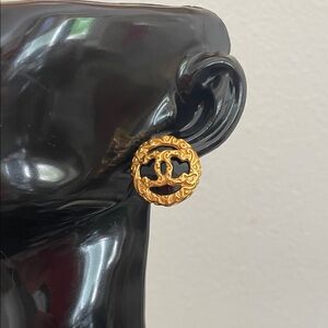 Luxurious CHANEL earrings with iconic logo. Gold and black design. Perfect for elegance.