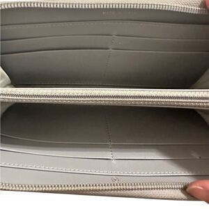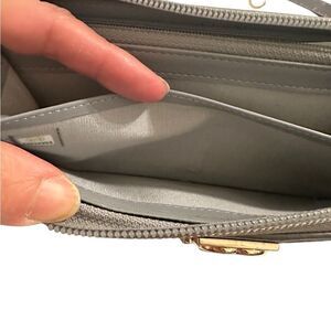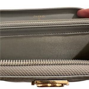 This luxurious Chanel wallet features a sophisticated gray hue and a distinctive diamond-quilted leather exterior. The elegant gold-toned clasp adds a touch of opulence, making it a perfect accessory for any occasion.