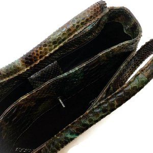 Chanel's green and brown python snakeskin features a front and back exterior slit pocket and large structured space with interior zipper pouch. Detailed with a twisting signature CC logo closure in brushed silver along with bottom hardware that is branded. An attached woven chain and leather key strap holder is included.