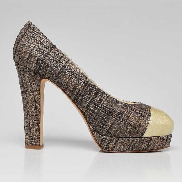 Chanel Grey Raffia and Patent Leather Cap Toe Platform Pumps Size 10.5/41
