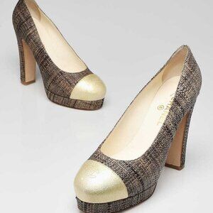 These chic and easy-to-wear Chanel Grey Raffia and Patent Leather Cap-Toe Platform Pumps are a great addition to any wardrobe! Shoes feature tweed uppers with "CC" logos embroidered on each toe in gold patent leather and a chunky heel. This is a fabulous style any fashionista would not want to miss!