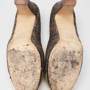 The soles have soiling and wear from normal use. The uppers have light wear on the raffia but the patent cap toe is smooth and clean. The footbeds are clean with light signs of use.