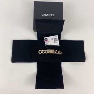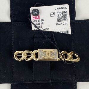 Authentic Gold-tone metal Chanel hair clip with crystal embellishments and chain-link accent