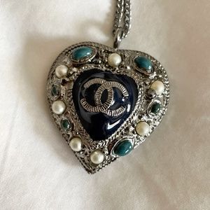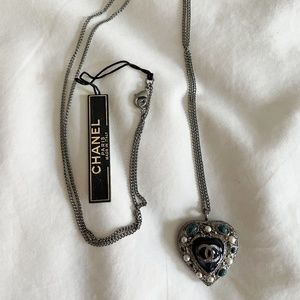 Chanel Dark Silver Heart Necklace with Green & Blue Enamel and Pearls