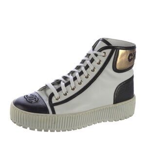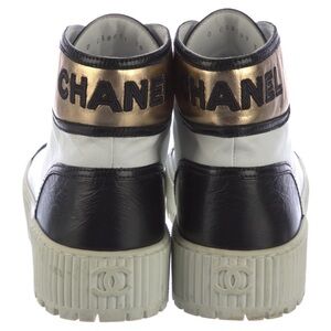 Chanel high-top sneakers featuring a stylish black, white, and gold design. Perfect for a chic and modern look.