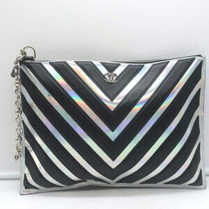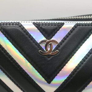 Chanel Holographic Chevron Zip Pouch Black & Silver Medium Wristlet Clutch Bag