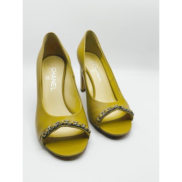 Chic Chanel open-toe pumps in a beige mustard patent leather with a block heel. Features a silver-tone chain ankle strap with the iconic interlocking CC logo. Stylish and comfortable, perfect for day or night.