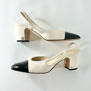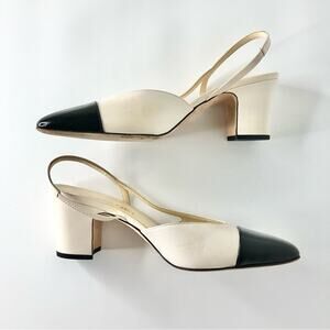 Chanel Interlocking CC Beige Glazed Calfskin Cap Toe Slingback Heeled Pumps 39
