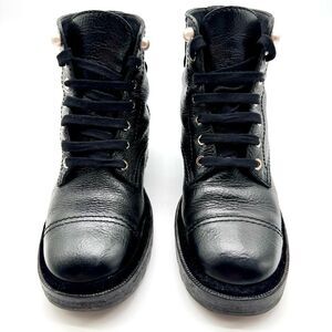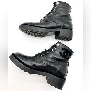Chanel Interlocking CC Combat Pearl Leather Black Ankle Boots EU 38.5 US 7.5-8
