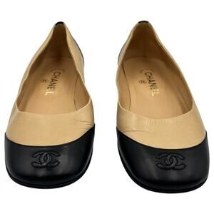 Chanel Interlocking CC Logo Cap Toe Ballet Flats Shoes Beige Black Size IT 37.5 US 7.5