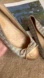 There is a gold leather patch professionally sewn on each shoe. Professionally Re-soled bottoms. Estimated to fit a size 9-9.5 (but see the measurements)