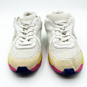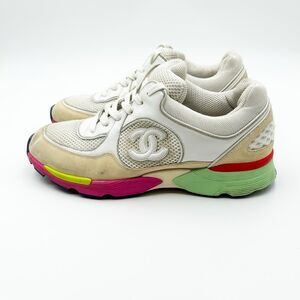 Authentic pair of CHANEL Suede Calfskin CC Sneakers size EU 41, which is usually equivalent to a US women’s 10-10.5 White, Pink, and Green. These stylish sneakers are crafted of white suede and calfskin leather with a Chanel CC on each side.