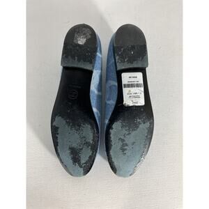 Chanel Interlocking Cc Logo Blue Denim Ballet Flats Size 7: denim and white cc logo, cap toe, ballet style, 0.25in heel height, light discoloration and outsole wear at the toe, light discoloration on outer right heel, scuff mark on inner left heel, leather on the outsole has worn.