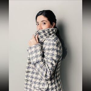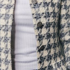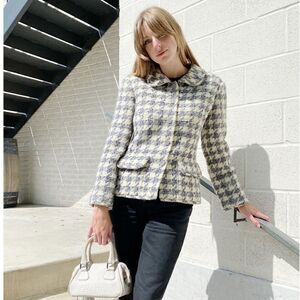 Loving the combination of texture and print on this 1998 Chanel wool coat. Bold cream and grey houndstooth print make a statement with big “CC” silver button closures. Jacket is fully lined in silk with two front pockets. This jacket is the perfect play on print.