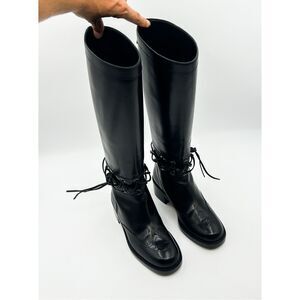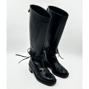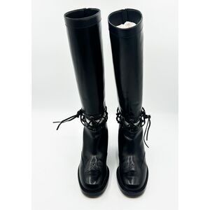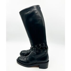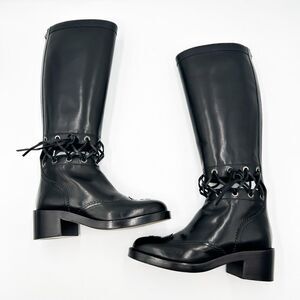 Chanel Knee High Boots Cap Toe Black Leather Lace Up Cutout