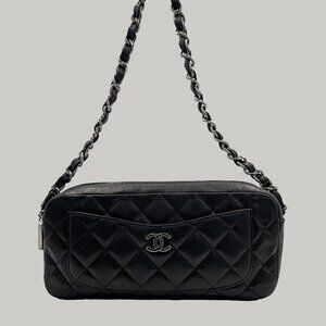 It features a leather-threaded silver chain shoulder strap, a front pocket with a silver CC logo.