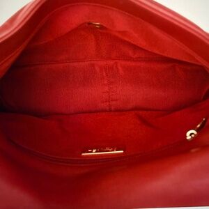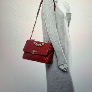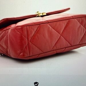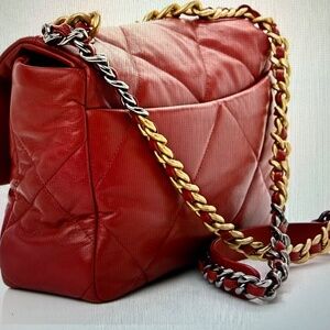 authentic Chanel Lambskin Quilted Large Chanel 19 Flap in burgundy. This stylish shoulder bag is crafted of diamond quilted Lambskin leather in burgundy.