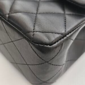 Features: Diamond quilted lambskin leather in black. The bag features black chain link leather threaded shoulder straps and a front flap with a black Chanel CC turn lock. This opens to an all-black leather interior with patch pockets.