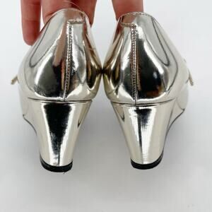 These Chanel wedge pumps showcase a sophisticated blend of luxury and modern edge. Crafted from laminated metallic gold (very pale, almost silver) calfskin, they feature the iconic grosgrain cap toe with an elegant pointed silhouette. The subtle CC logo detailing enhances their timeless appeal, while the wedge heel offers a comfortable lift.