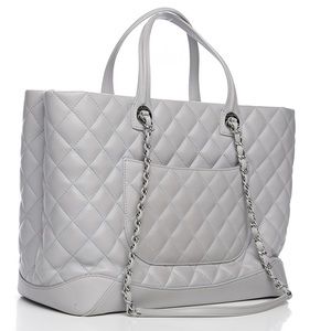 Authentic Quilted Chanel tote. Lovely light grey color. Silver hardware. Great pre owned condition. Has some scuffing at the bottom and some creasing at the bottom corners. I do not have the authenticity card, dust bag or box. Poshmark will authenticate the item for you upon purchase.