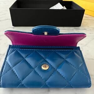 Chanel Leather Quilted Card Holder Wallet Blue teal w/box + reciept