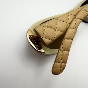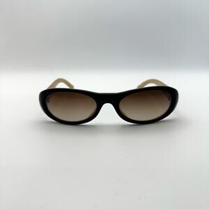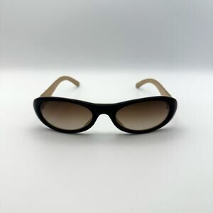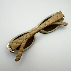 From Chanel. Style number 5129Q in Color 71113. Brown oval lens frame sunglasses with beige leather quilted temple. Gold hardware accents. Serial number along interior of lenses. Does not come with original sunglasses case. Vintage Y2K styling. Preowned in good condition with no stains or tears.