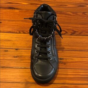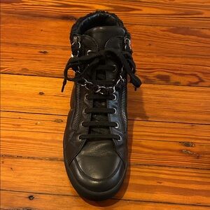 Black leather high top sneaker. Blue and black shimmer tweed around ankle. Silver chain zipper on either side of shoe with black and blue tweed intertwined. Only worn once! There are a couple of strands coming off of the tweed (see photos). No noticeable. All four zippers work, versatile wear. Chanel logo on outside of either sneaker.
