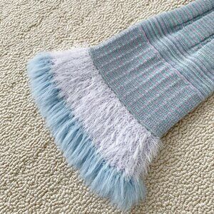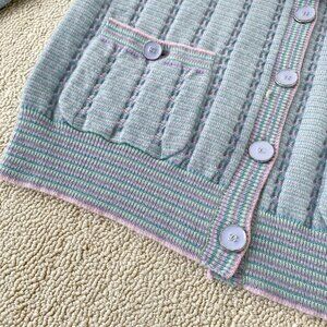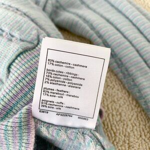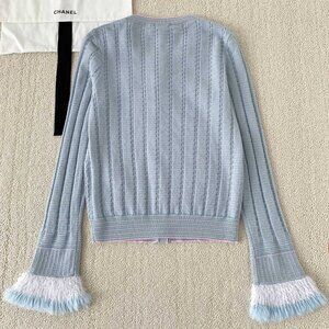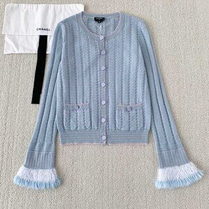 This Chanel light blue knit cardigan features a classic silhouette crafted with meticulous knitting techniques. The round neckline is complemented by a row of delicate buttons, while dual side pockets feature subtle brand detailing. The standout detail lies in the gradient fringe trim adorning the cuffs, infusing the entire piece with a touch of whimsy. The light blue hue exudes fresh elegance, blending the brand's timeless heritage with innovative design. Perfect for everyday styling to showcase refined taste, it also reveals a sense of sophistication in its intricate details. This versatile piece effortlessly combines fashion-forward style with premium quality.