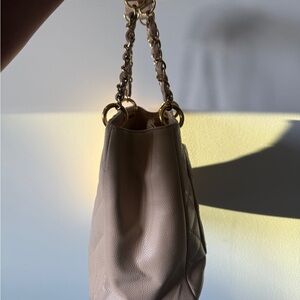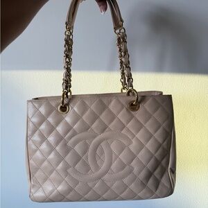 Chanel shoulder bag with quilted design. Features gold chain handles. Iconic and stylish. This bag has a little discoloration on the back that can be properly treated by a professional (it’s denim transfer because the bag is light). The inside has light marks from just use of the bag but I do not see any harsh stains. No entrupy certificate for this. I purchased it from the Chanel store before it was discontinued. Great tote!