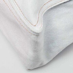 The exterior denim remains clean and beautiful with minor soiling on the pockets and some light rubbing on the edges. The hardware is bright and crisp. The interior has a few faint spots but remains clean overall and in great condition.