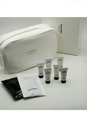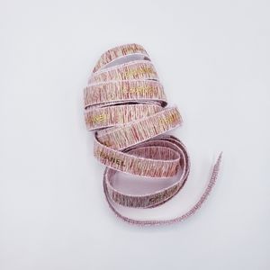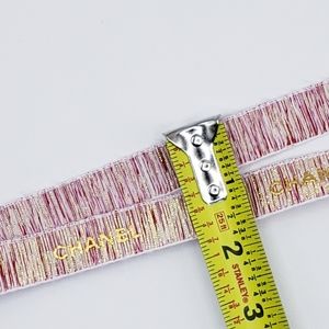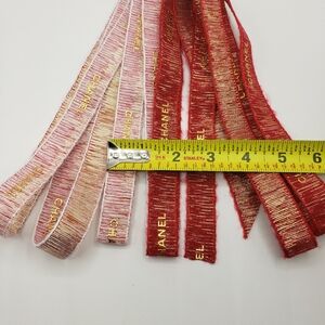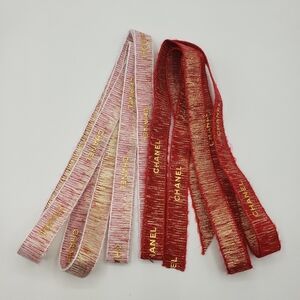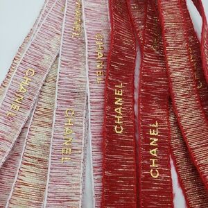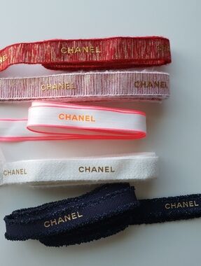 Signature CHANEL Logo White/Gold ribbon 100 inches long, Red/Gold 46 inches long, Pink/White/Gold 38 inches long, White/Neon Pink Orange 38 inches long, and Blue Navy/Gold 46 inches long.