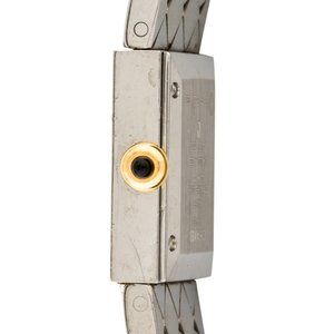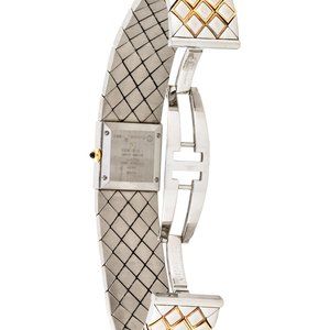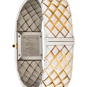 Stainless steel and 18K yellow gold 19mm x 19mm Chanel Matelassé watch featuring a quartz movement, smooth bezel, black dial and bracelet with double deployant clasp.